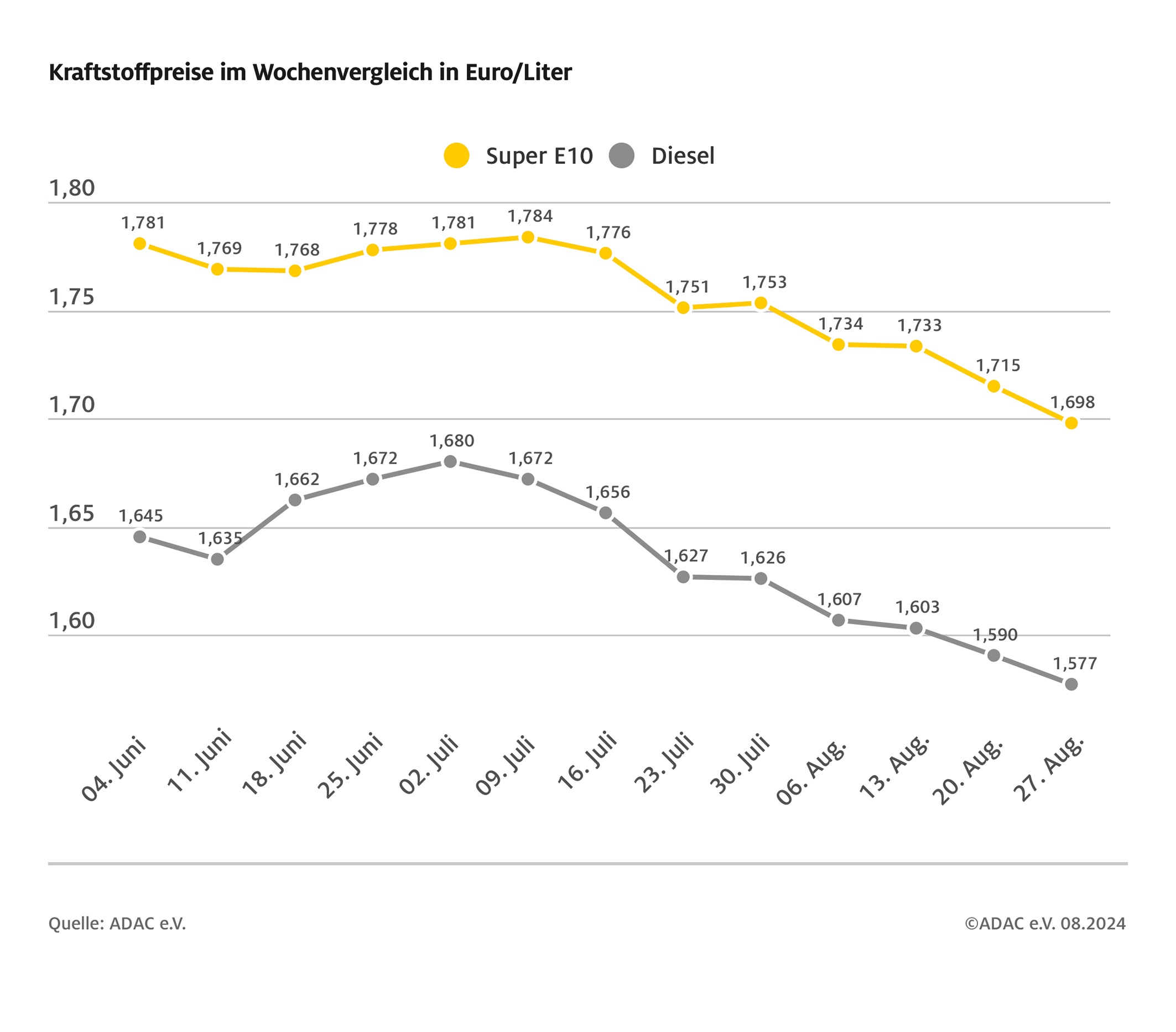 München (ots) – Die Kraftstoffpreise geben im Wochenvergleich weiter nach und erreichen in den letzten Tagen neue Jahrestiefststände. Das geht aus der aktuellen ADAC Analyse der Kraftstoffpreise von rund 14.000 Tankstellen in Deutschland hervor. Im bundesweiten Durchschnitt zahlen Autofahrerinnen und Autofahrer derzeit 1,698 Euro für einen Liter Super E10. Im Vergleich zur Vorwoche ist der Preis damit um 1,7 Cent gesunken (von 1,715 Euro je Liter vor Wochenfrist).
