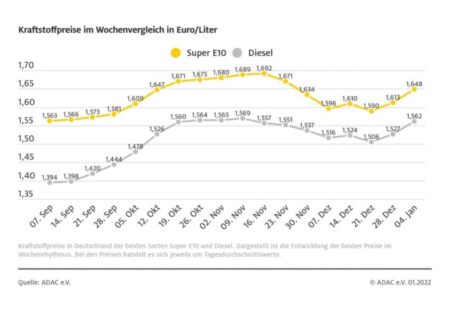 München (ots) – Das neue Jahr startet mit einem Anstieg der Spritpreise. Das ermittelt der ADAC in seinem wöchentlichen Preisvergleich. Demnach kostet ein Liter Super E10 im bundesweiten Mittel 1,648 Euro. Das entspricht einem Anstieg von 3,5 Cent im Vergleich zur Vorwoche. Ein Liter Diesel kostet aktuell an den Zapfsäulen im Bundesschnitt 1,562 Euro –…