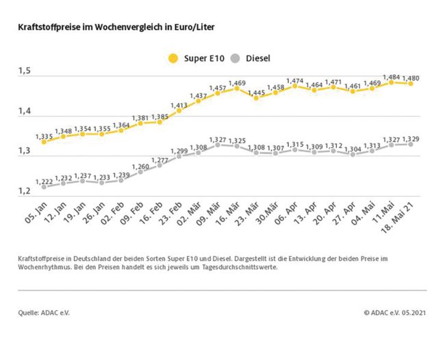 München (ots) – Die Autofahrer mussten im Mai 2021 beim Tanken erneut mehr bezahlen als im Monat zuvor. Für einen Liter Super E10 verlangten die Tankstellen in Deutschland im Schnitt 1,483 Euro und damit 1,7 Cent mehr als im April. Das zeigt die monatliche ADAC Auswertung der Kraftstoffpreise. Auch der Preis für Diesel kletterte weiter:…
