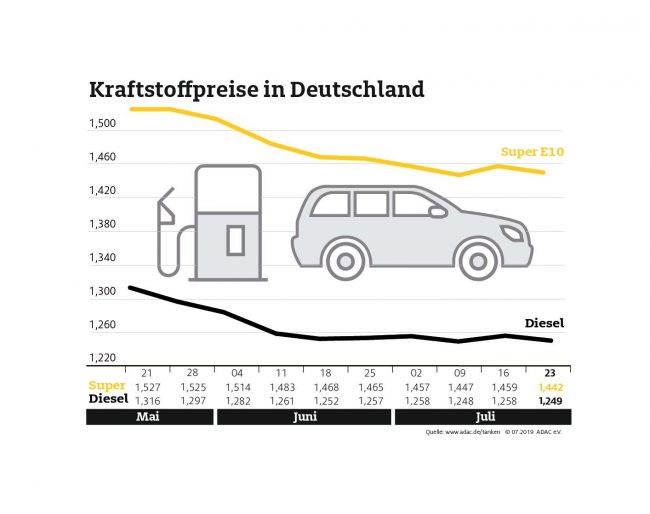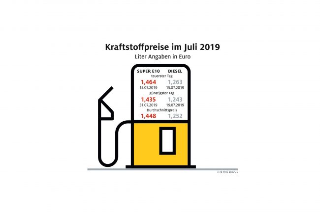München (ots) Der Rückgang der Kraftstoffpreise setzt sich fort. Autofahrer konnten im Juli den zweiten Monat in Folge billiger tanken. Laut der monatlichen Marktauswertung des ADAC kostete ein Liter Super E10 im Monatsmittel 1,448 Euro und damit 3,0 Cent weniger als im Juni. Diesel verbilligte sich gegenüber dem Vormonat um 0,9 Cent auf durchschnittlich 1,252 Euro…