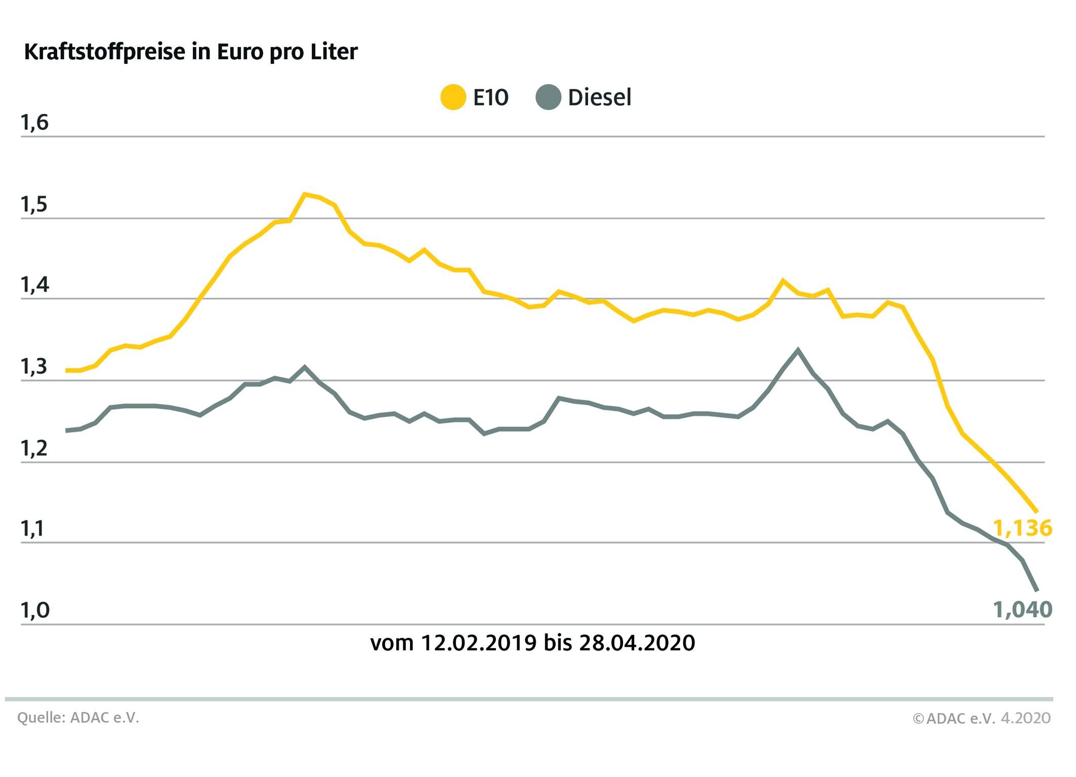 München (ots) – Die Kraftstoffpreise fallen weiter: Tanken ist im bundesweiten Durchschnitt bereits die zehnte Woche in Folge billiger geworden. Laut aktueller Auswertung des ADAC müssen Autofahrer für einen Liter Super E10 im Bundesmittel 1,136 Euro bezahlen, das sind 2,4 Cent weniger als in der Vorwoche. Diesel verbilligte sich um 3,8 Cent auf durchschnittlich 1,040 Euro je Liter und nähert sich damit der Marke von einem Euro.