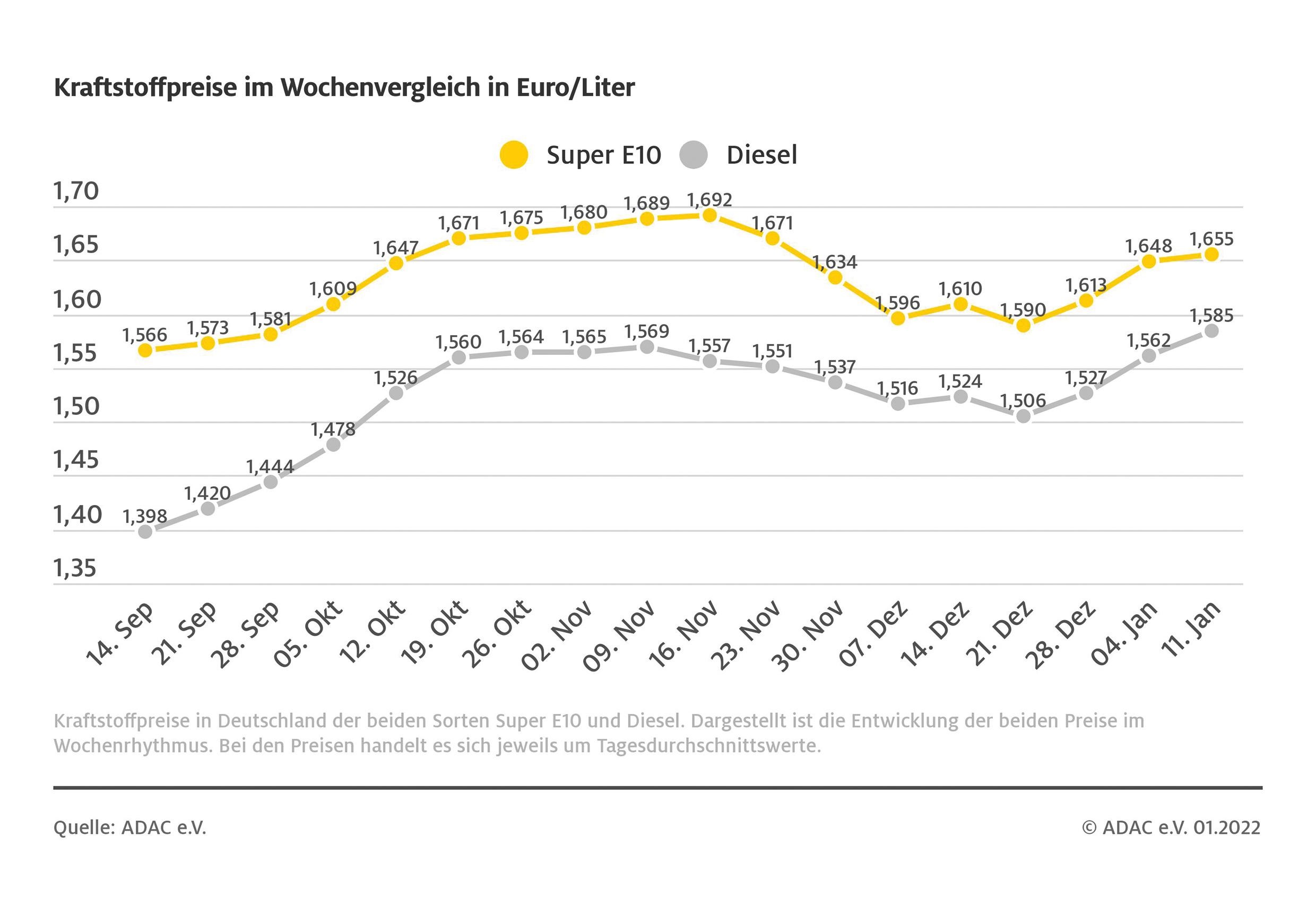 München (ots) – Der Preis für Dieselkraftstoff ist erneut kräftig gestiegen. Wie die aktuelle ADAC Auswertung der Kraftstoffpreise zeigt, kostet Diesel im bundesweiten Mittel derzeit 1,585 Euro je Liter. Das sind 2,3 Cent mehr als in der Vorwoche. Gleichzeitig blieb der Dieselpreis damit nur um 0,1 Cent unter dem Allzeithoch vom vergangenen Montag: Am 10. Januar 2022 kostete der Kraftstoff mit 1,586 Euro so viel wie nie zuvor.