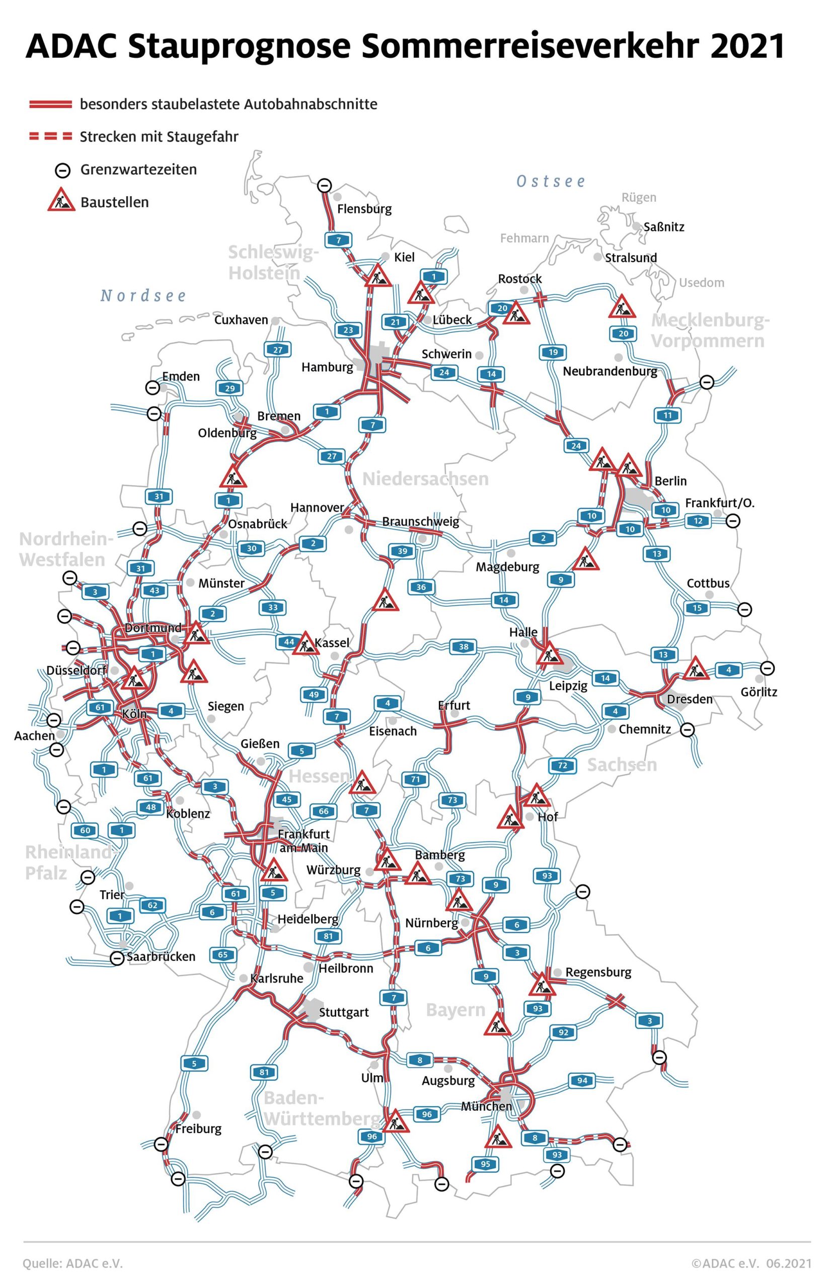 Staugefährdete Autobahnen im Sommer 2021