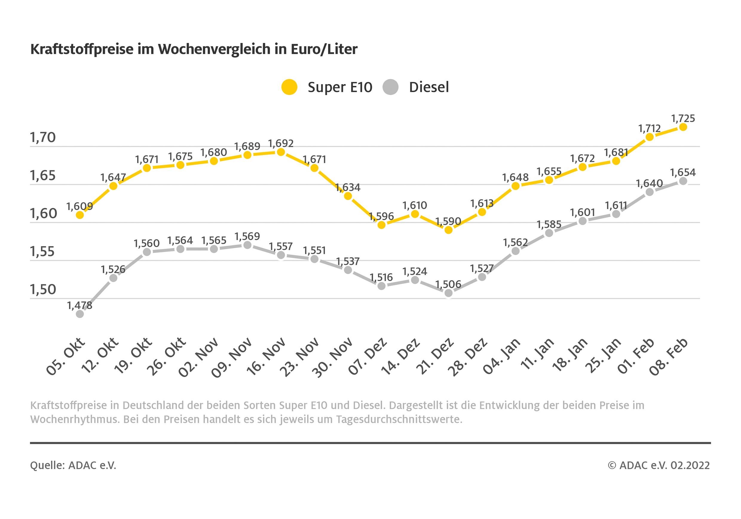 München (ots) – Tanken ist so teuer wie noch nie in Deutschland, beide Kraftstoffsorten haben neue historische Höchststände erreicht. Wie die aktuelle ADAC Auswertung der Kraftstoffpreise zeigt, kletterte der Preis für einen Liter Super E10 binnen Wochenfrist um 1,3 Cent und liegt aktuell im bundesweiten Mittel bei 1,725 Euro. Der Preis für Diesel-Kraftstoff stieg um 1,4 Cent auf 1,654 Euro.