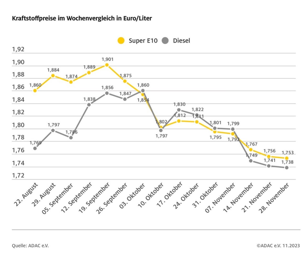 Seit Mitte des Monats November haben sich die Kraftstoffpreise weiter stabilisiert, sie treten mehr oder weniger auf der Stelle. Das zeigt die aktuelle ADAC Auswertung der Kraftstoffpreise in Deutschland. Danach kostet ein Liter Super E10 im bundesweiten Schnitt 1,753 Euro – das sind 0,3 Cent weniger als vor einer Woche. Auch Diesel ist um 0,3 Cent günstiger: Für einen Liter müssen die Autofahrerinnen und Autofahrer derzeit 1,738 Euro bezahlen.